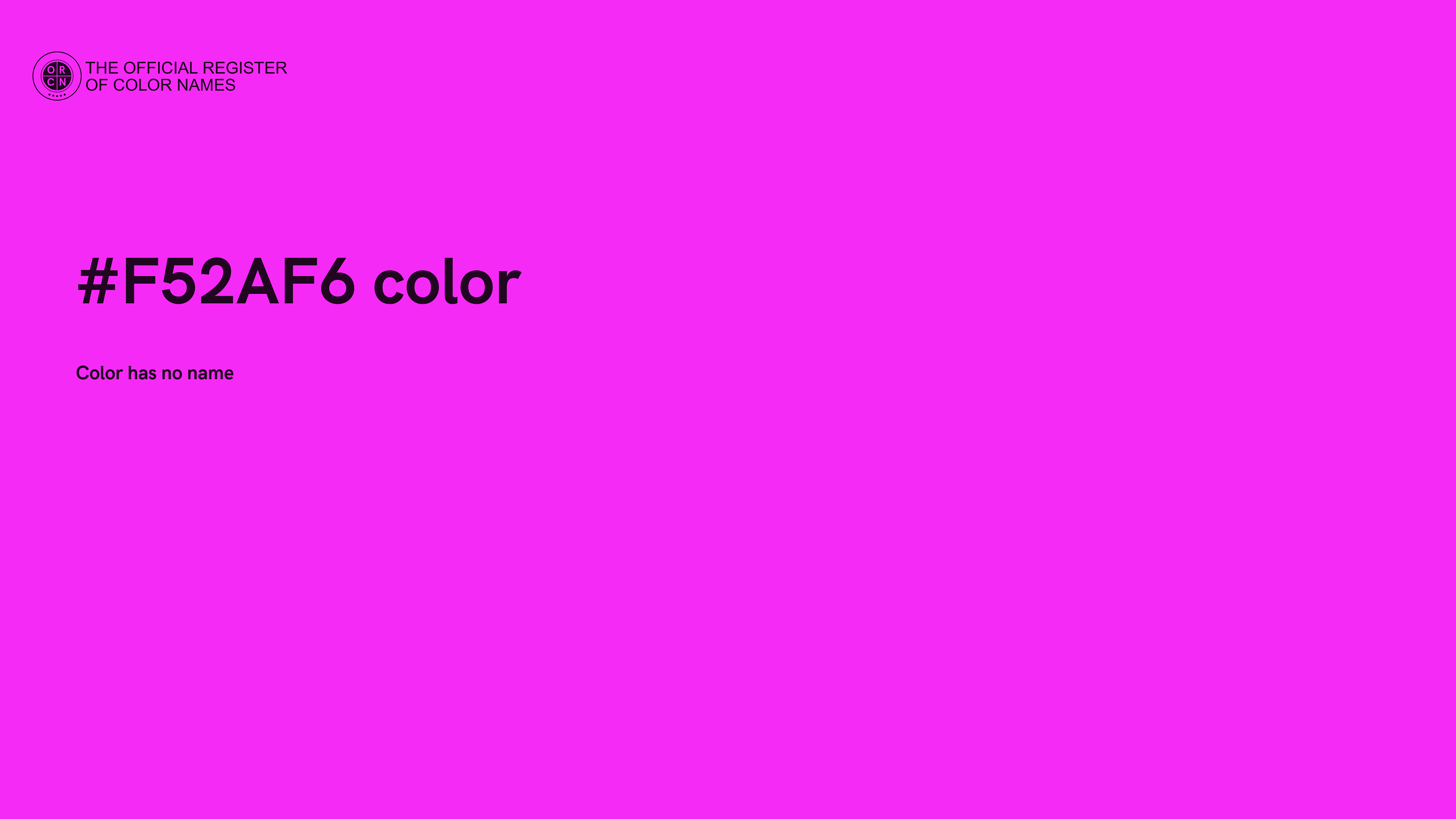 HEX code #F52AF6 represent the color in hexadecimal format by combining three values – the amounts of Red, Green and Blue (RGB). Its RGB composition is 245, 42, 246 ( rgb(245, 42, 246) ), which breaks down into 96.1% of Red, 16.5% Green and 96.5% Blue.