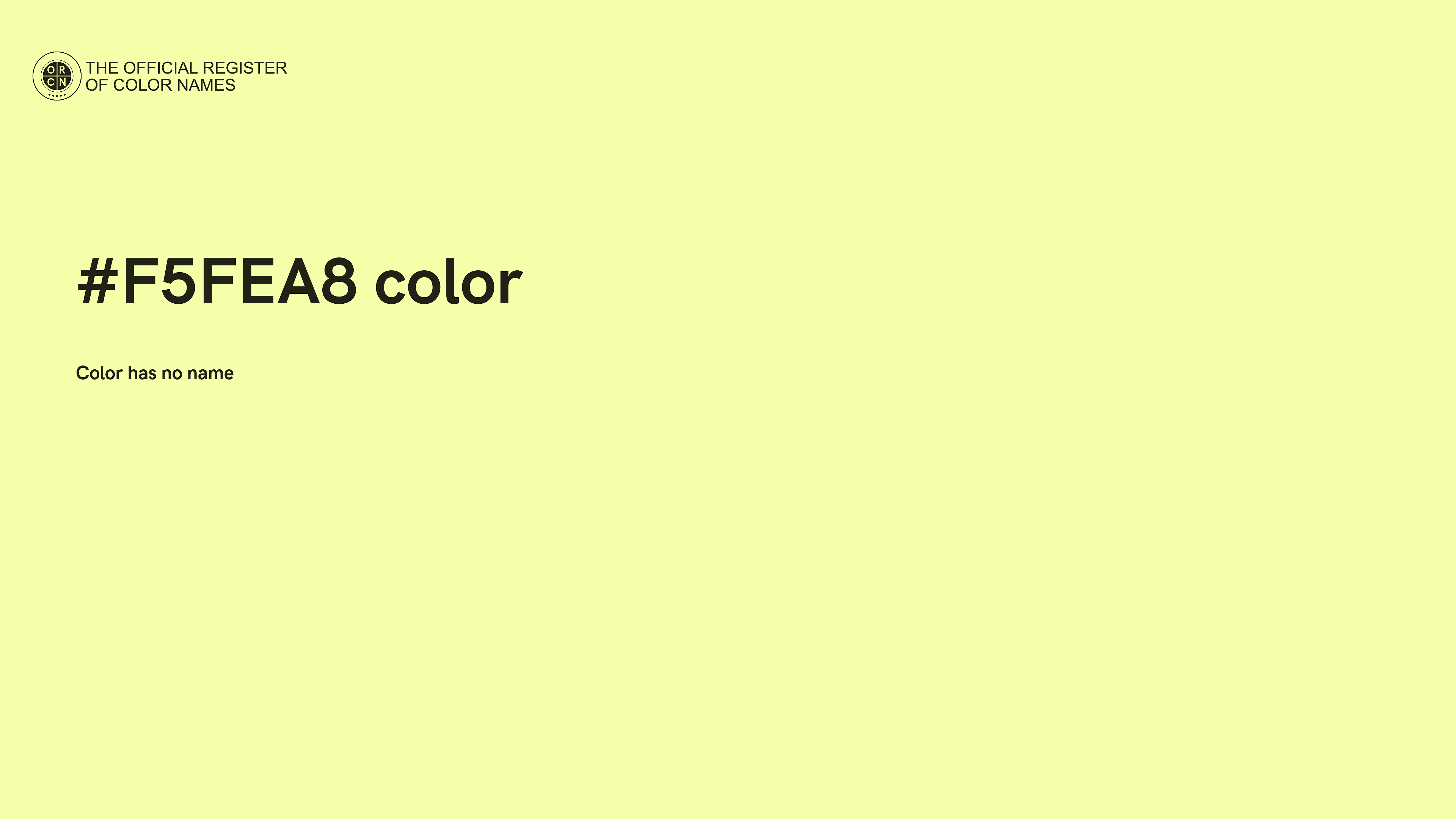 The digital color HEX #F5FEA8 belongs to the Yellow Color Family featuring Full Saturation (Saturation Family) and Very Light (Brightness Family).