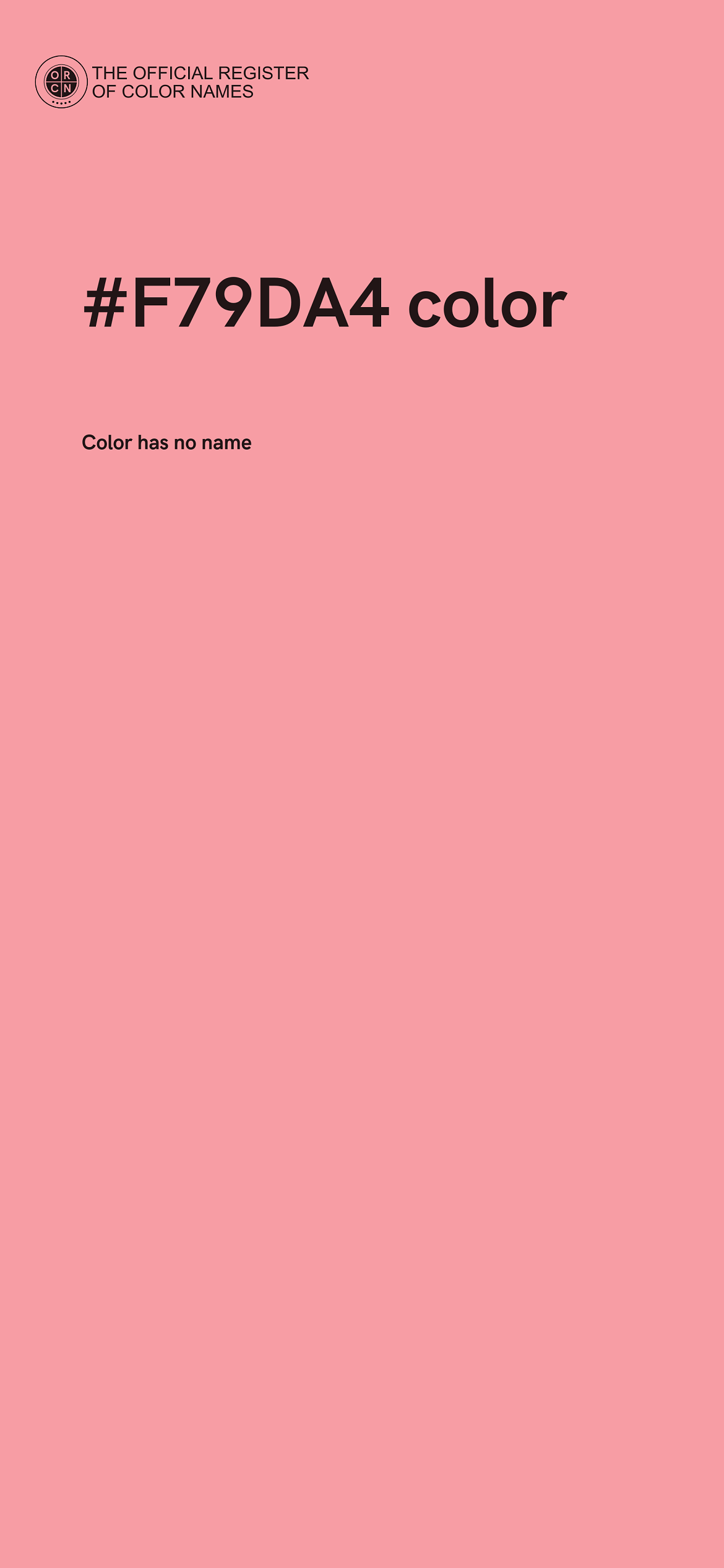 For printing in non digital world, #F79DA4 is represented in CMYK as 0 Cyan, 35 Magenta, 33 Yellow, and 3 Black (Key) (C:0 M:35 Y:33 K:3).