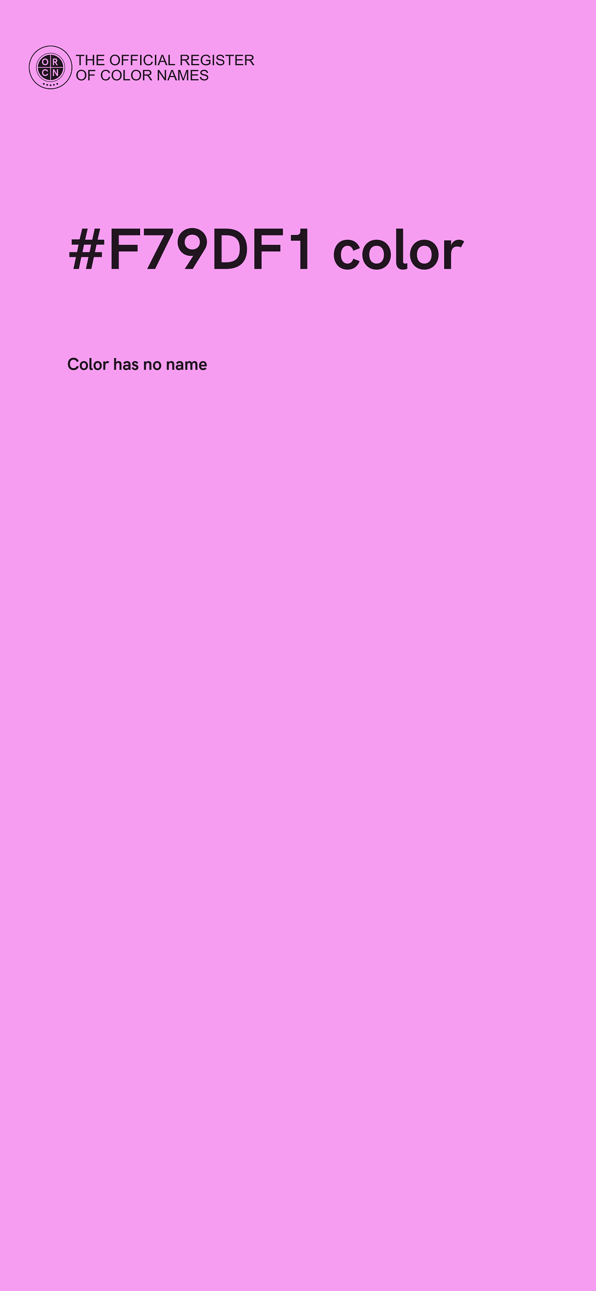 The digital color HEX #F79DF1 belongs to the Magenta Color Family featuring Full Saturation (Saturation Family) and Very Light (Brightness Family).
