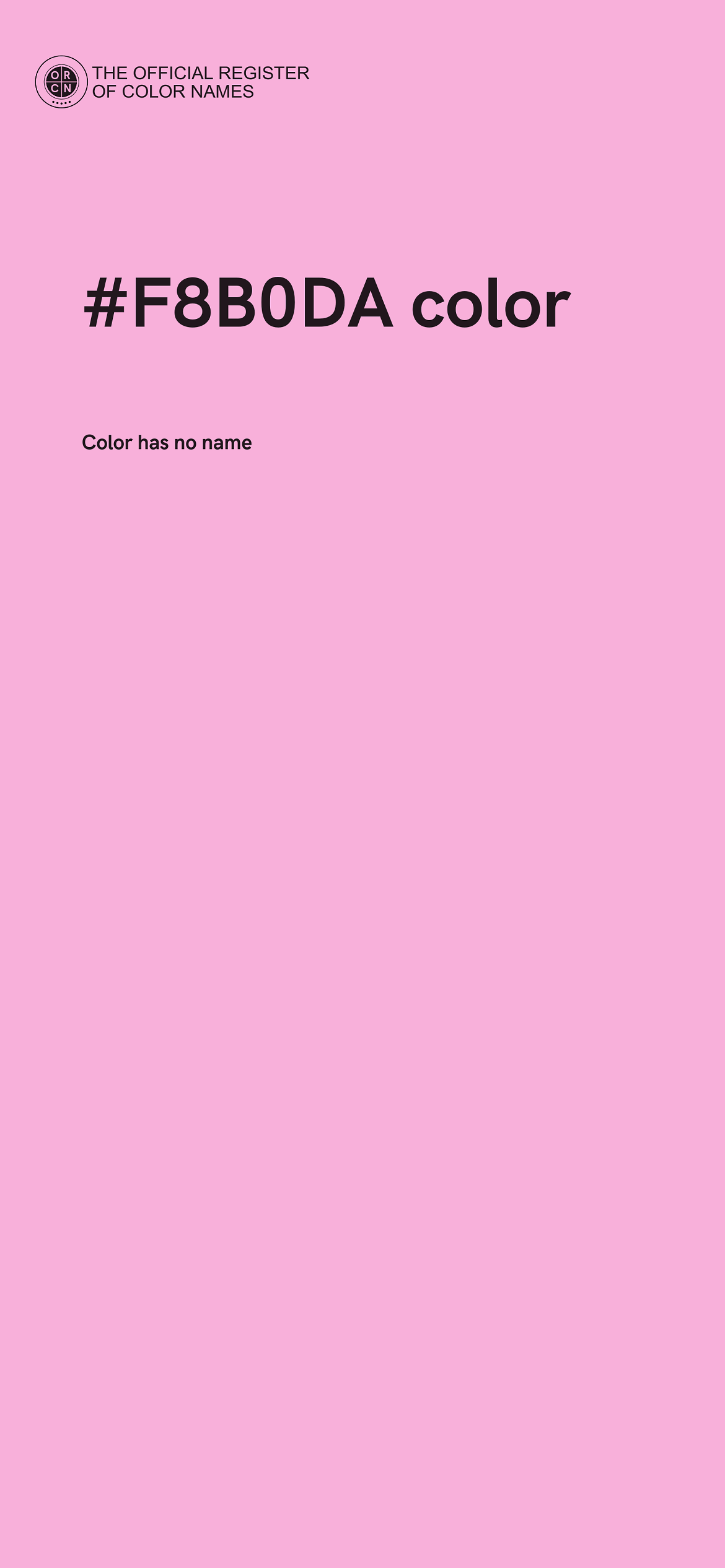 The digital color HEX #F8B0DA belongs to the Rose Color Family featuring High Saturation (Saturation Family) and Very Light (Brightness Family).