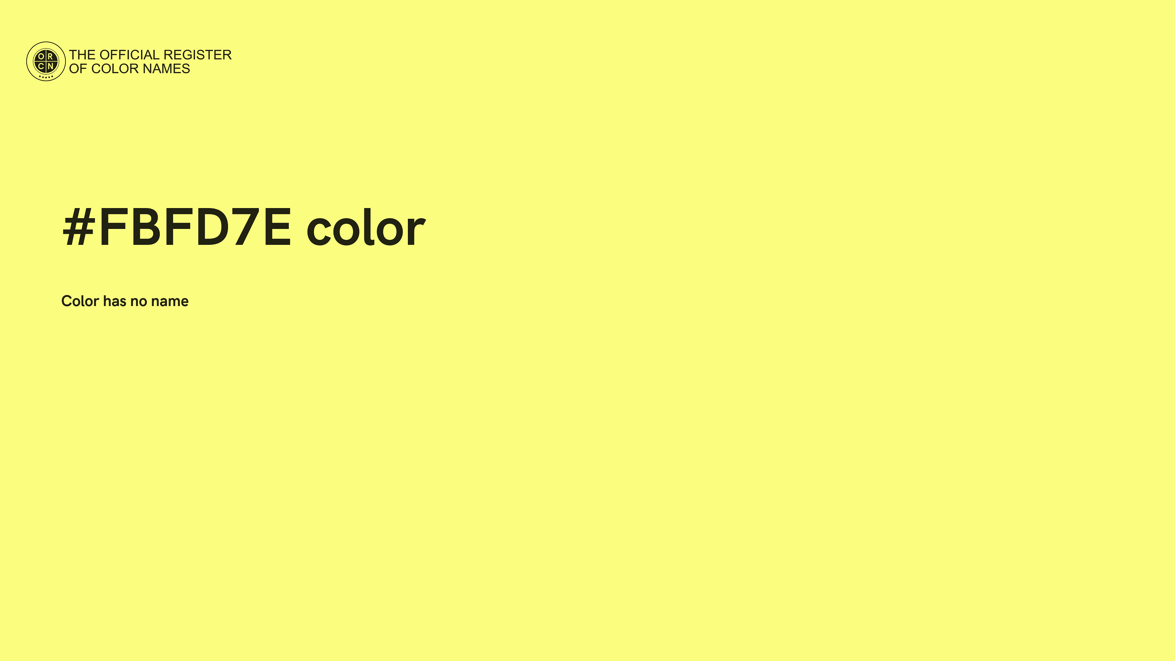 HEX code #FBFD7E represent the color in hexadecimal format by combining three values – the amounts of Red, Green and Blue (RGB). Its RGB composition is 251, 253, 126 ( rgb(251, 253, 126) ), which breaks down into 98.4% of Red, 99.2% Green and 49.4% Blue.