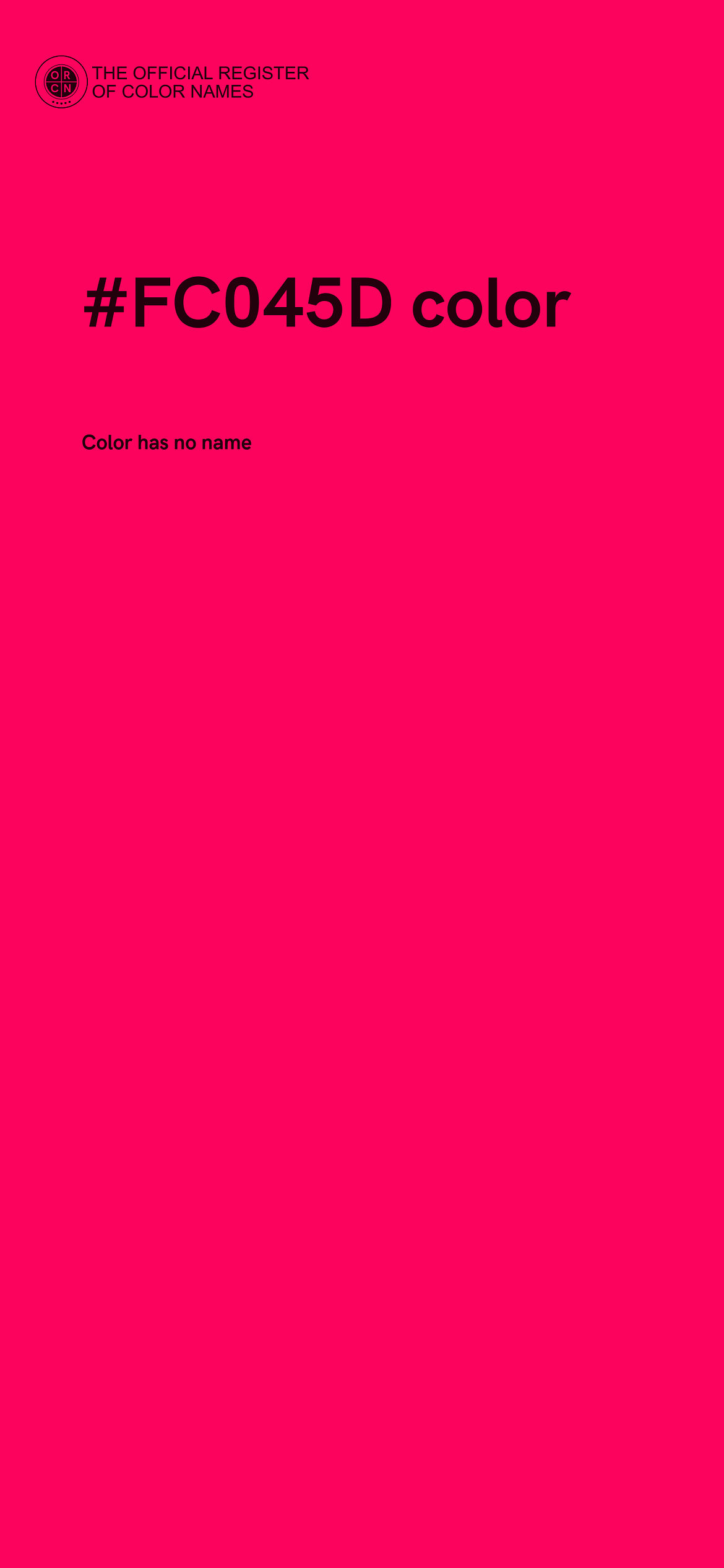 The digital color HEX #FC045D belongs to the Rose Color Family featuring Full Saturation (Saturation Family) and Light (Brightness Family).