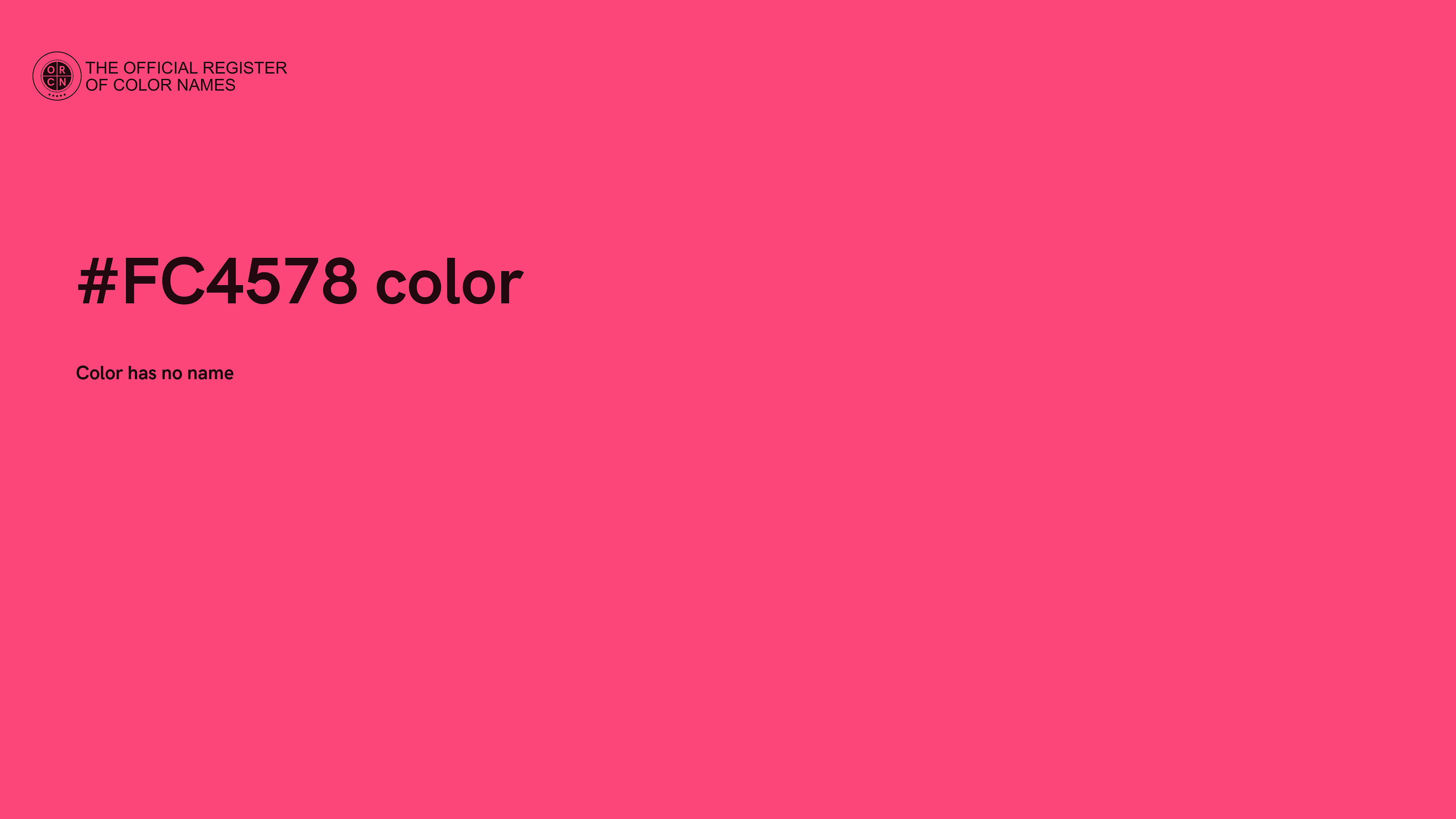 The digital color HEX #FC4578 belongs to the Rose Color Family featuring Full Saturation (Saturation Family) and Very Light (Brightness Family).