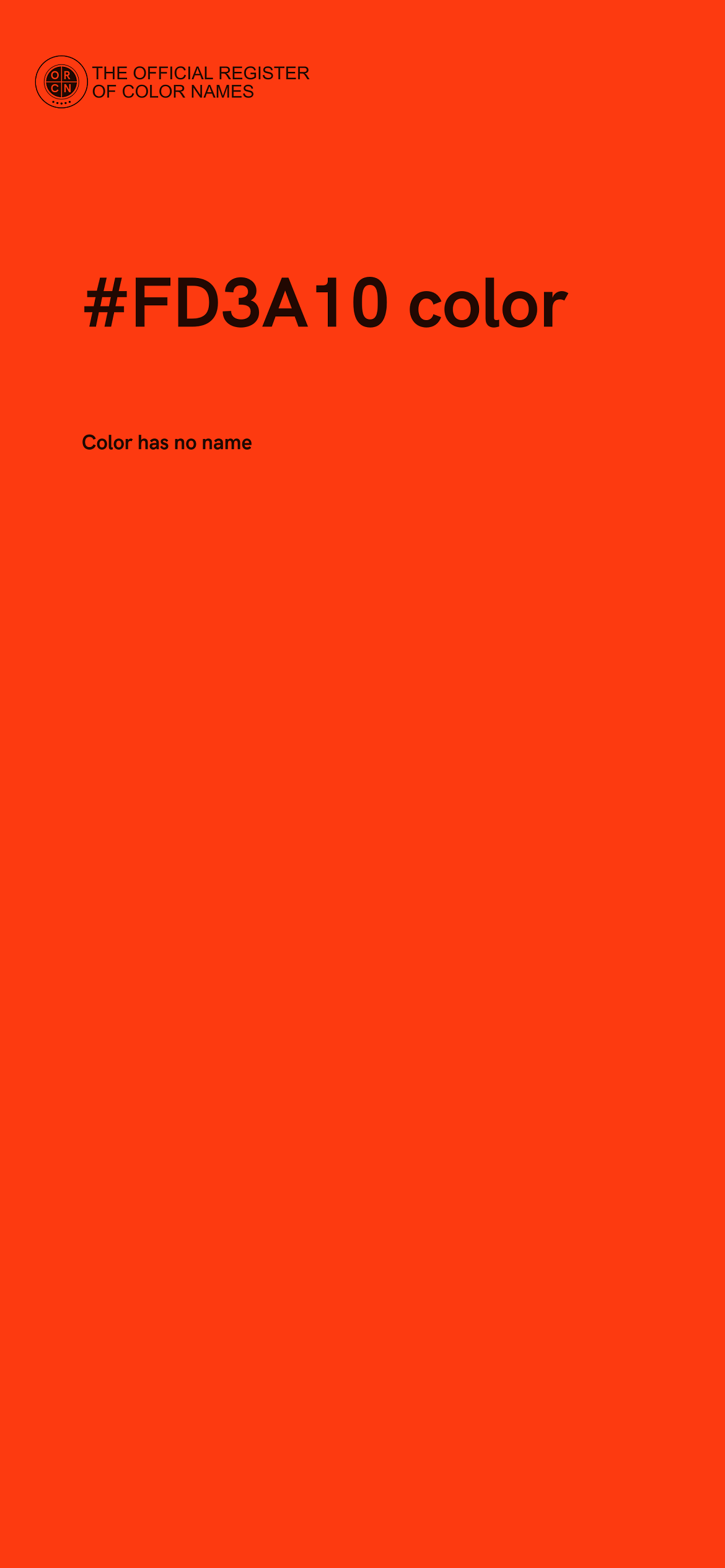 The digital color HEX #FD3A10 belongs to the Red Color Family featuring Full Saturation (Saturation Family) and Light (Brightness Family).