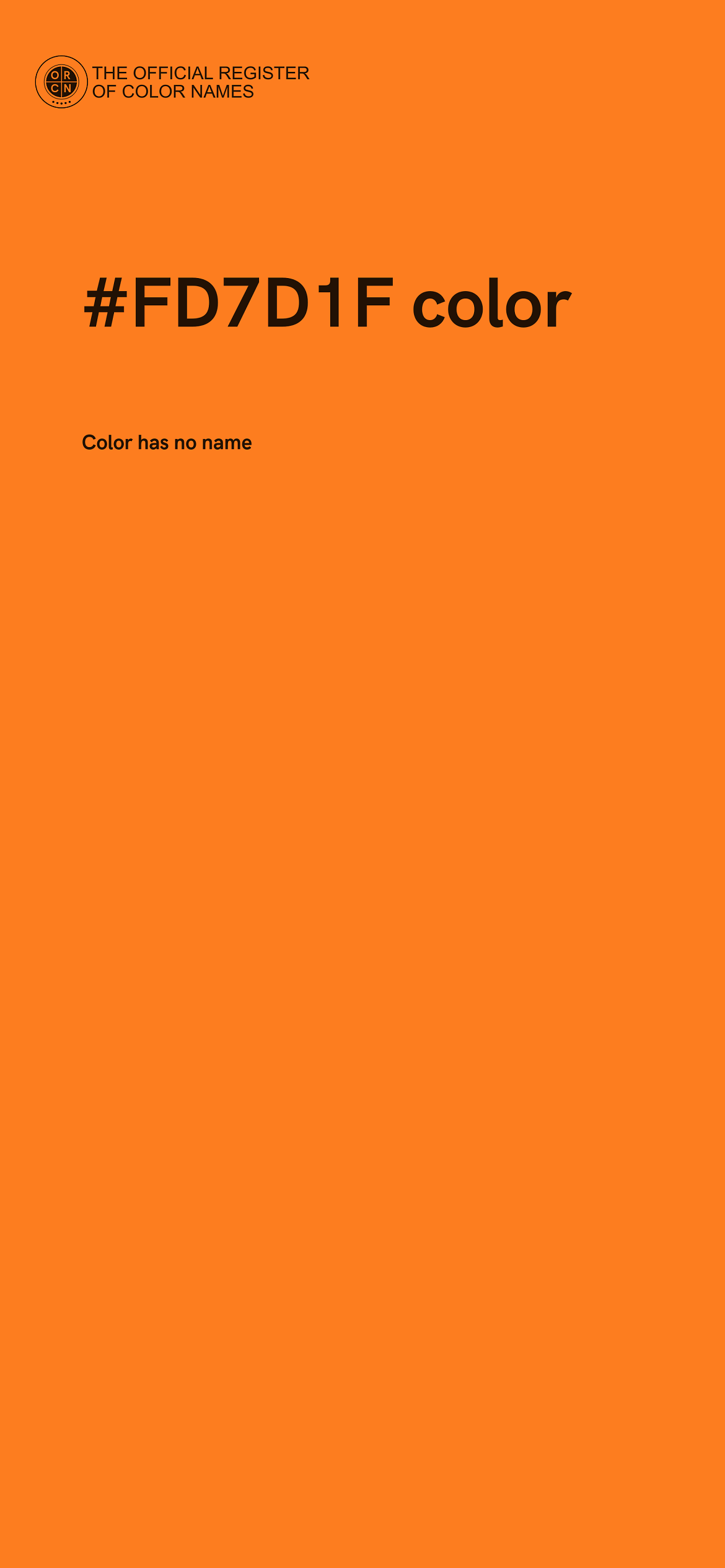 The digital color HEX #FD7D1F belongs to the Orange Color Family featuring Full Saturation (Saturation Family) and Light (Brightness Family).