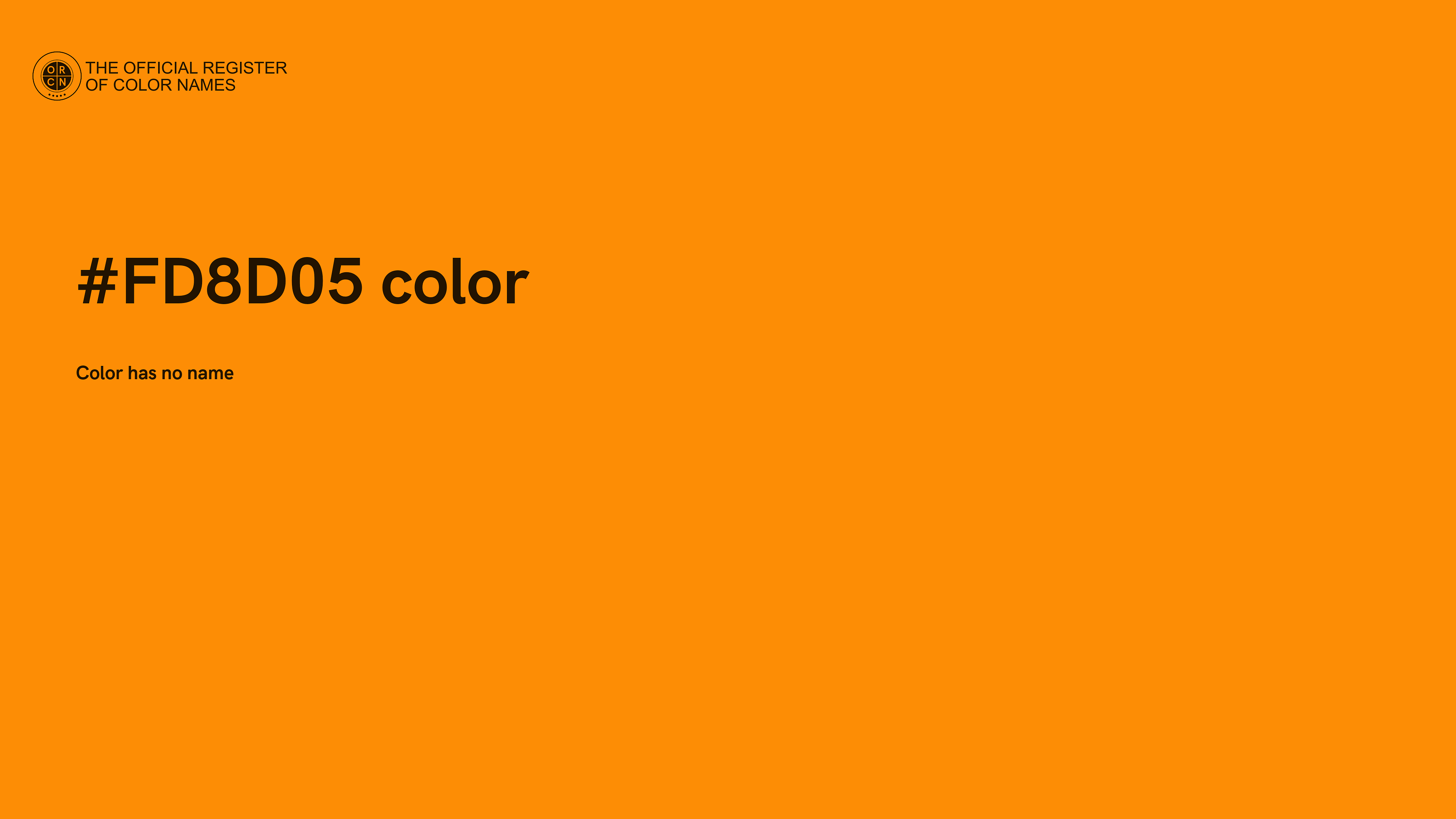The digital color HEX #FD8D05 belongs to the Orange Color Family featuring Full Saturation (Saturation Family) and Light (Brightness Family).