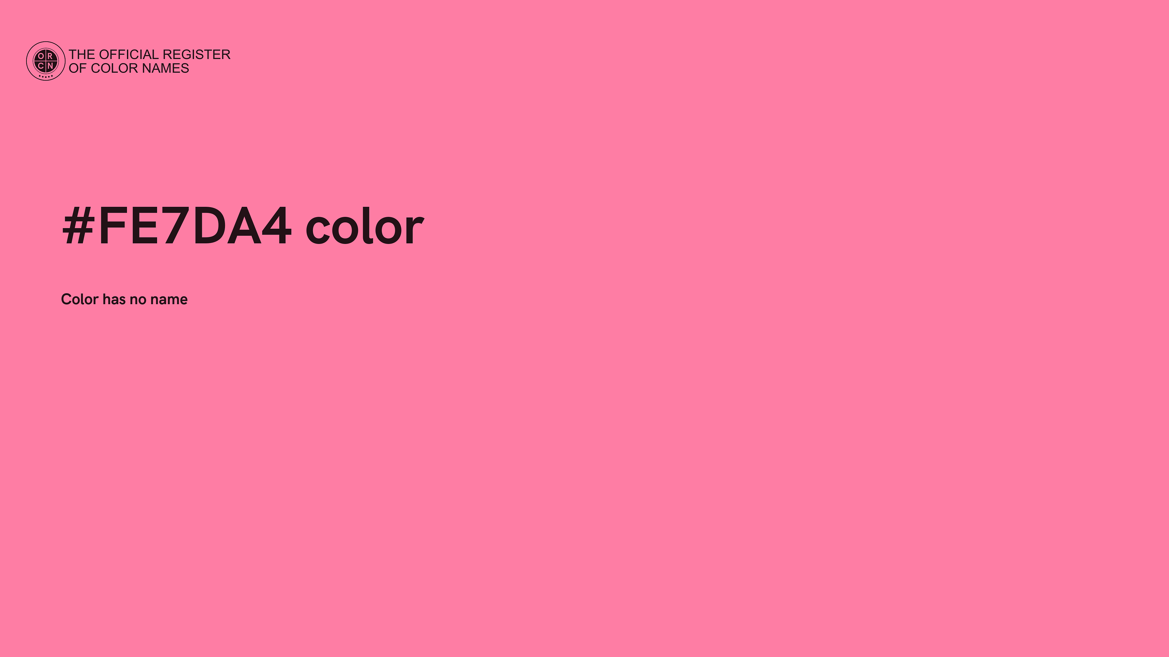 The digital color HEX #FE7DA4 belongs to the Rose Color Family featuring Full Saturation (Saturation Family) and Very Light (Brightness Family).