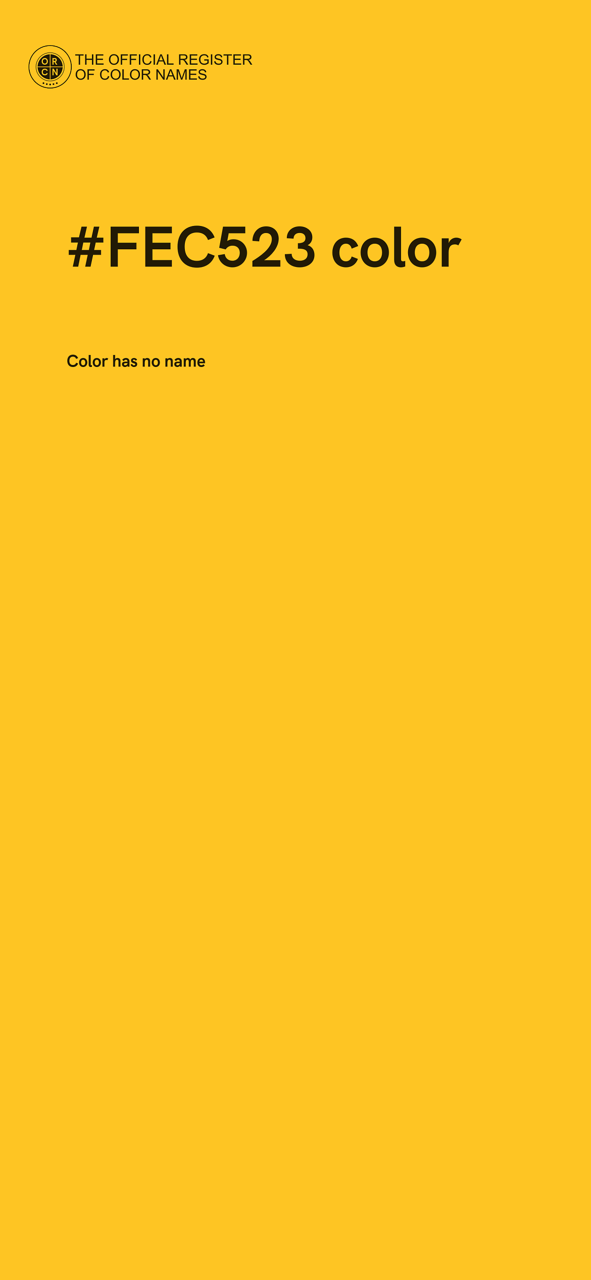 The digital color HEX #FEC523 belongs to the Orange Color Family featuring Full Saturation (Saturation Family) and Light (Brightness Family).
