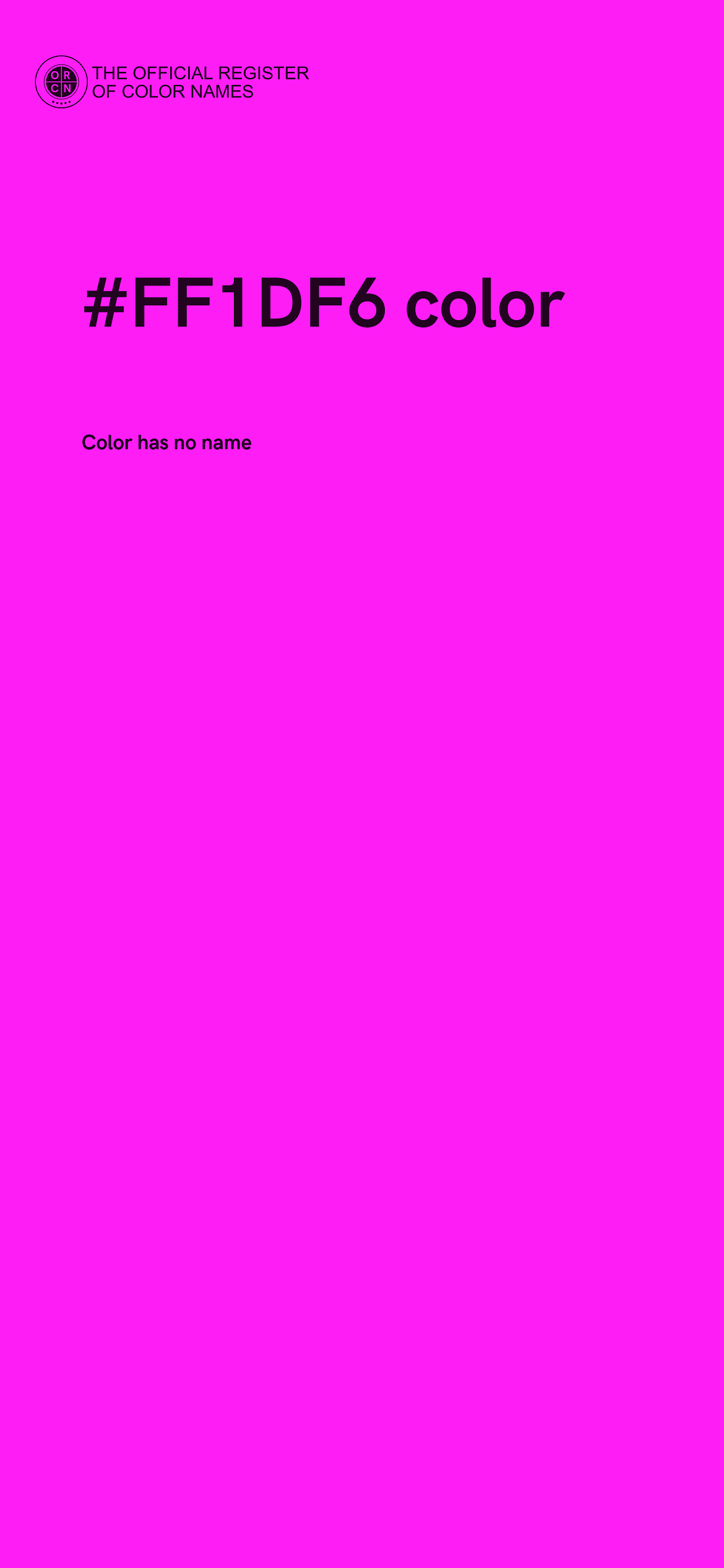 The digital color HEX #FF1DF6 belongs to the Magenta Color Family featuring Full Saturation (Saturation Family) and Light (Brightness Family).