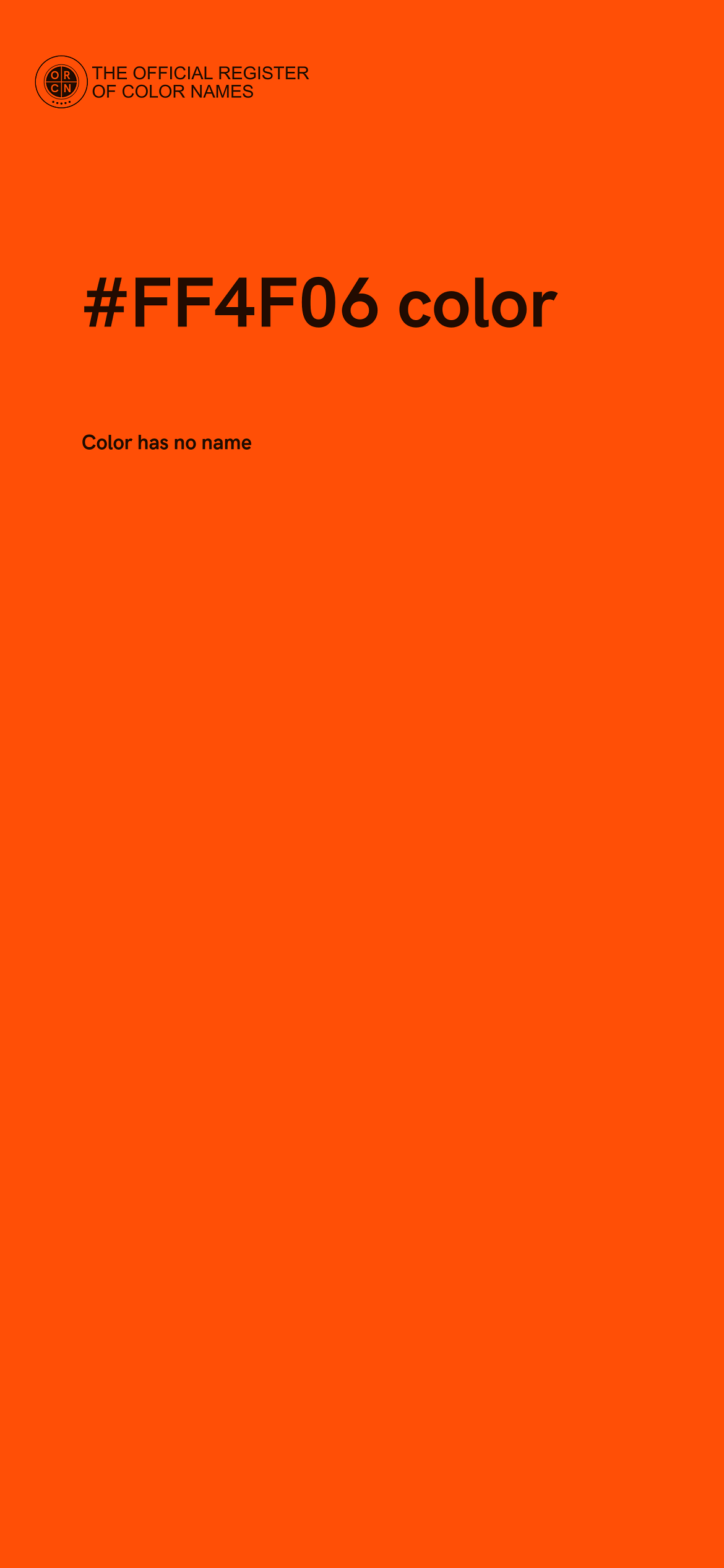 The digital color HEX #FF4F06 belongs to the Orange Color Family featuring Full Saturation (Saturation Family) and Light (Brightness Family).