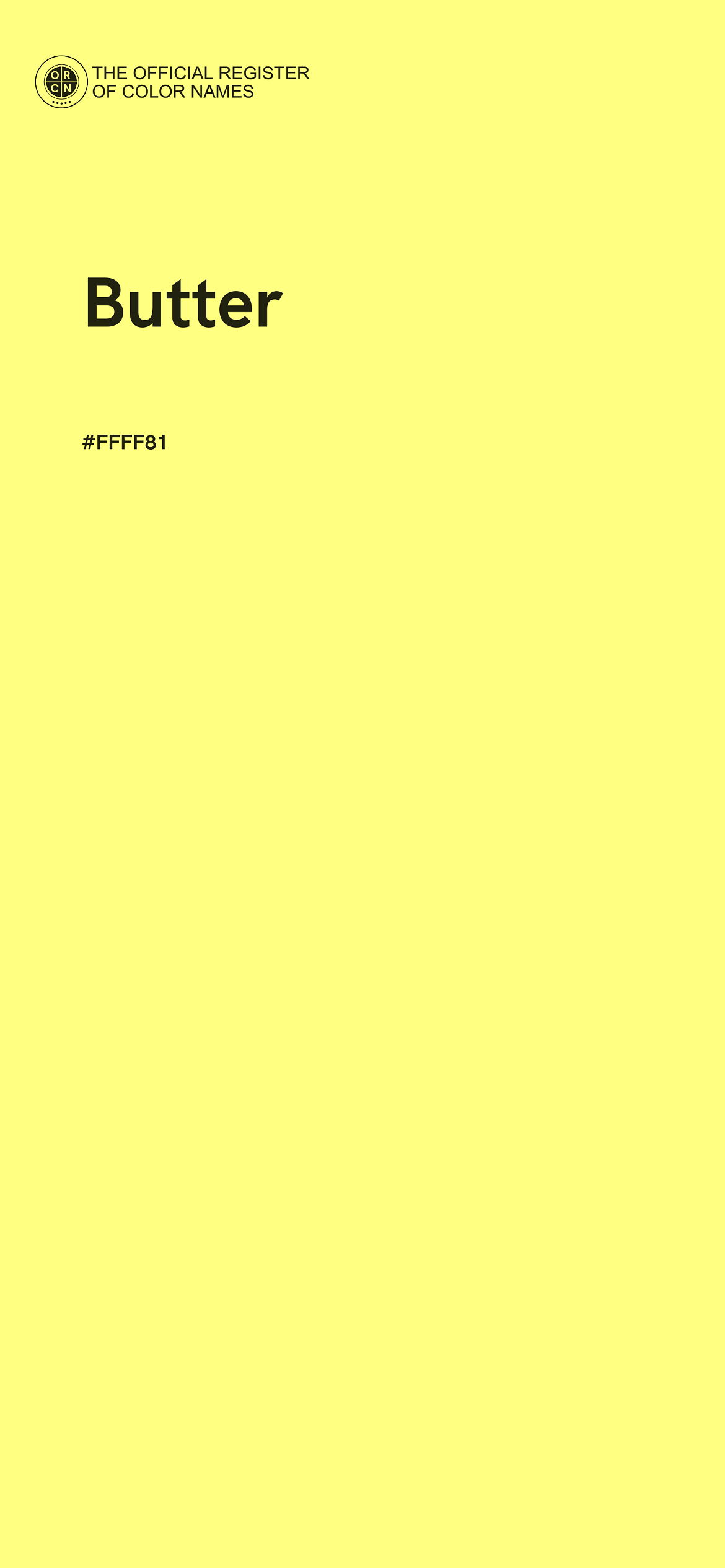 The digital color HEX #FFFF81, known as "Butter", belongs to the Yellow Color Family featuring Full Saturation (Saturation Family) and Very Light (Brightness Family).