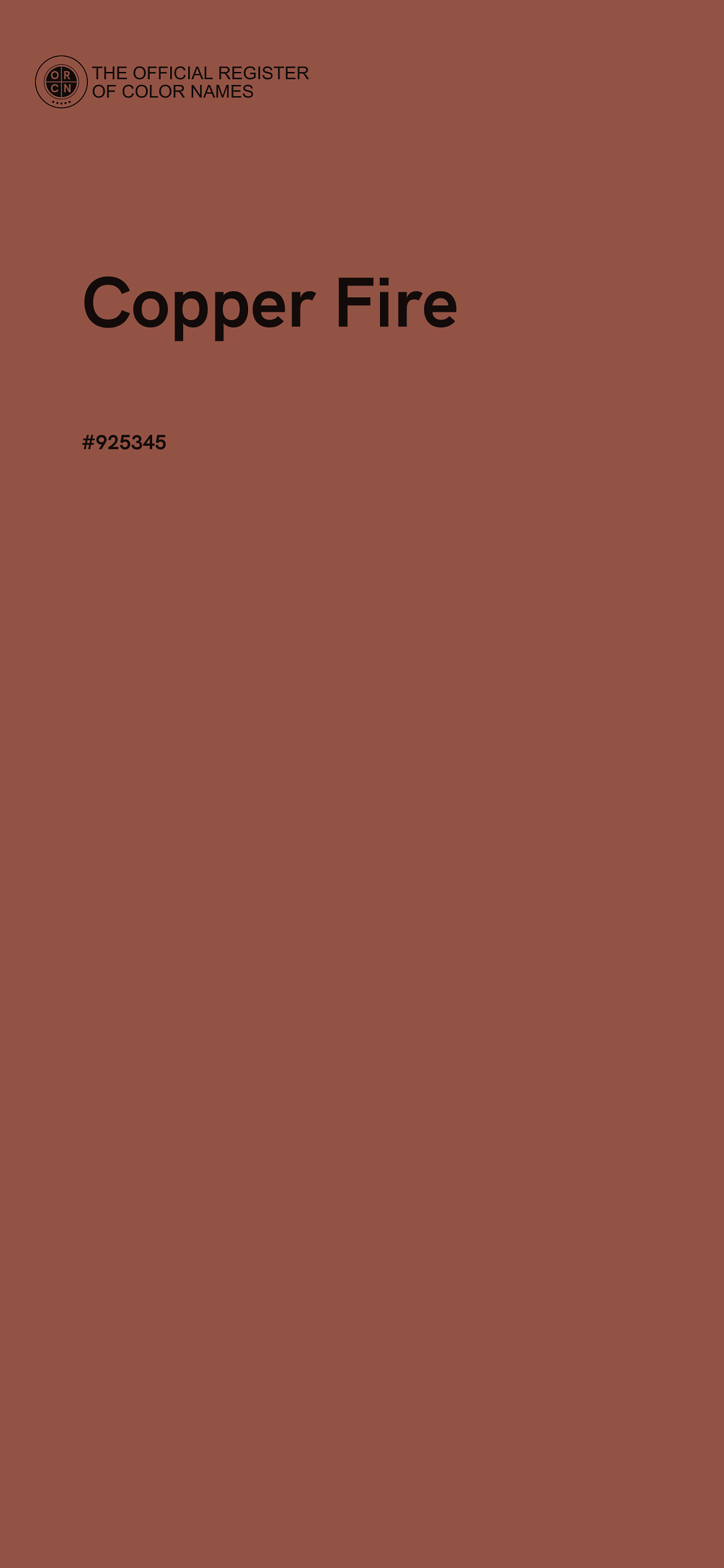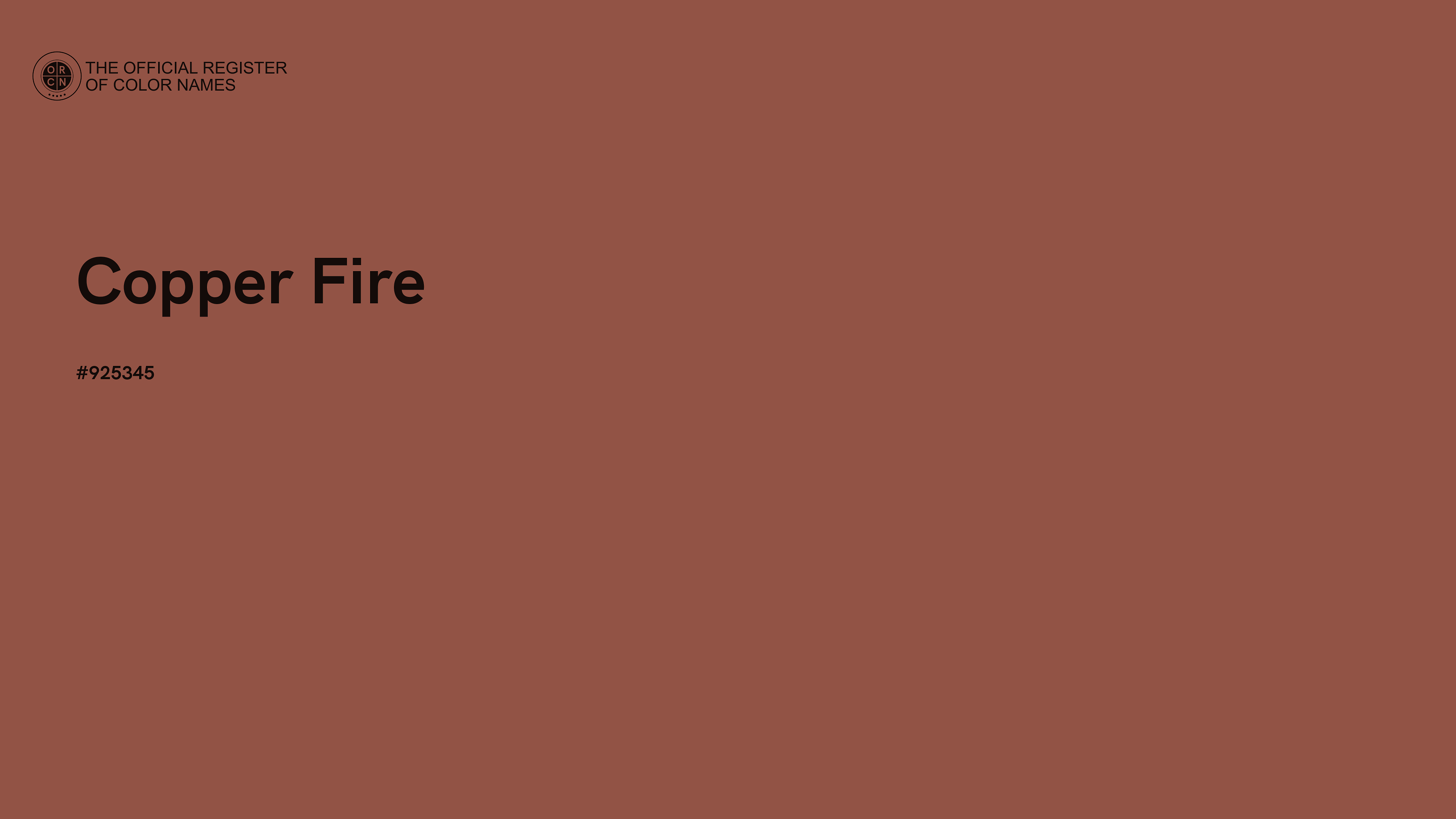 The digital color HEX #925345, known as "Copper Fire", belongs to the Red Color Family featuring Mild Saturation (Saturation Family) and Light (Brightness Family).