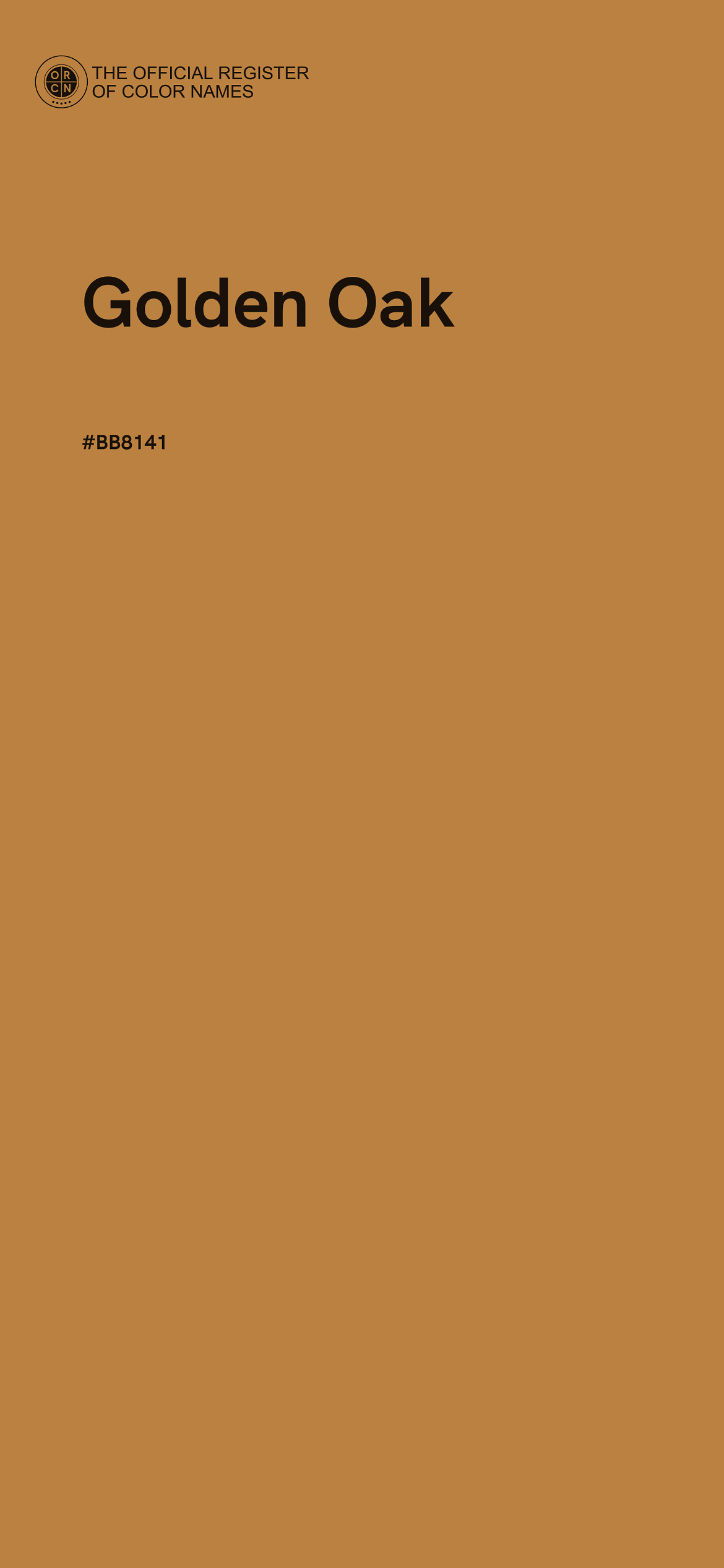 The digital color HEX #BB8141, known as "Golden Oak", belongs to the Orange Color Family featuring Moderate Saturation (Saturation Family) and Light (Brightness Family).