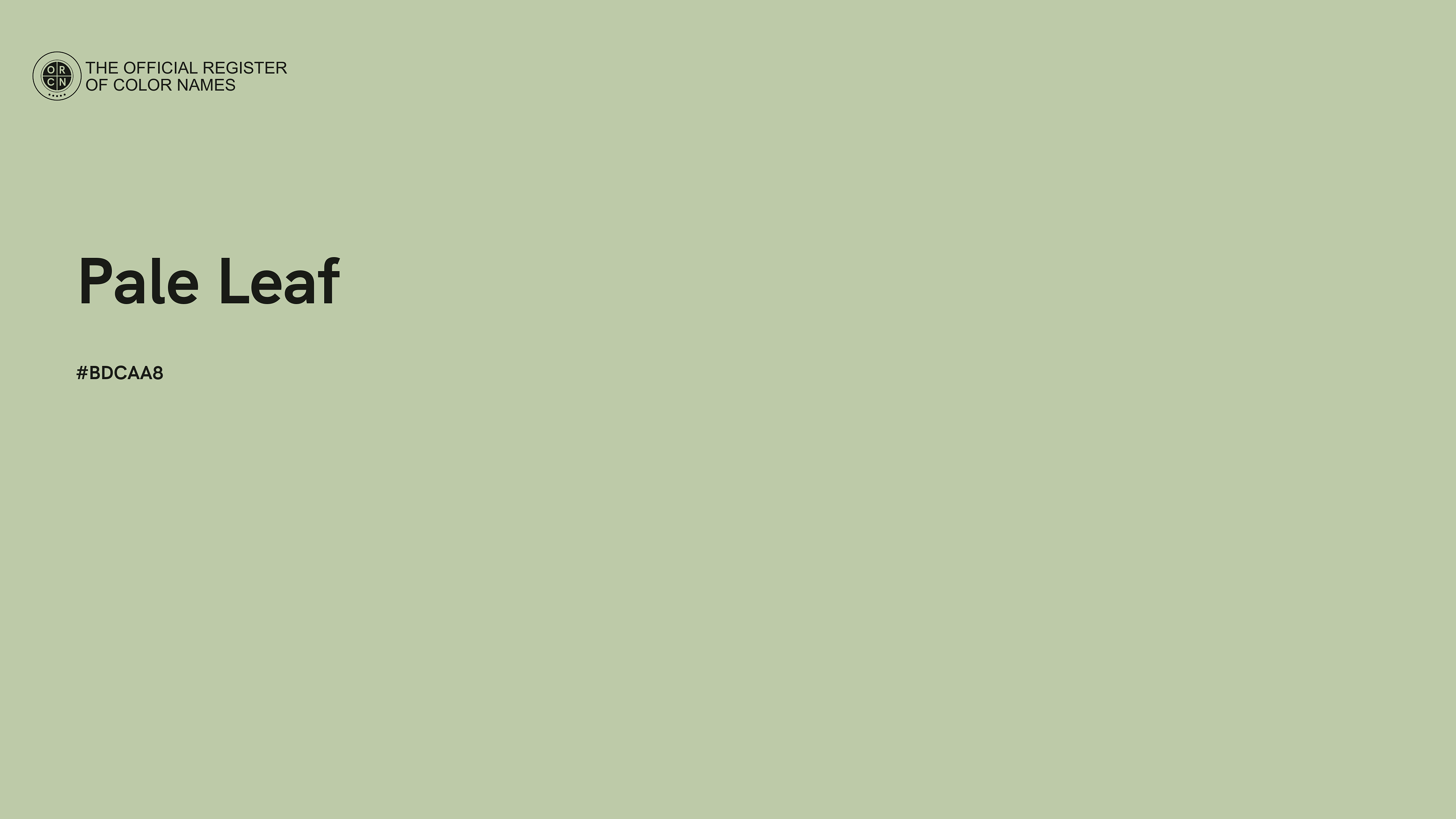 The digital color HEX #BDCAA8, known as "Pale Leaf", belongs to the Chartreuse Color Family featuring Low Saturation (Saturation Family) and Very Light (Brightness Family).